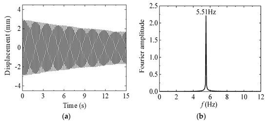 Taking the damping-free structure with span length and suspended mass of 4 kg as an example, Figure 11 presents the measured mid-span displacement time history and corresponding frequency spectrum. Following the release of initial displacement, the bridge exhibits characteristic free-decay vibration behavior. After 15 s, the vibration amplitude shows only minimal attenuation, indicating inherently low damping characteristics of the structure.