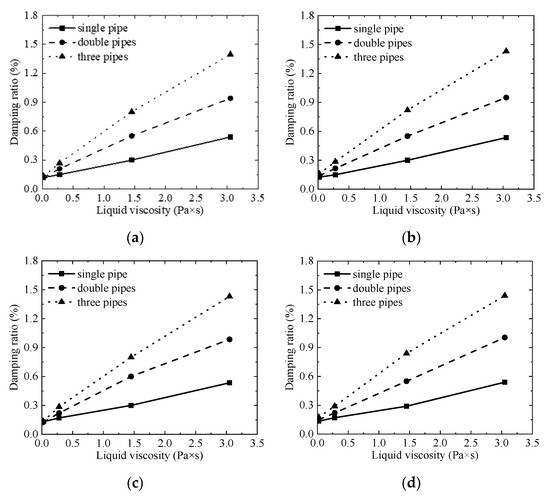 System damping with different liquid viscosity: (a) Mass = 4 kg; (b) Mass = 5 kg; (c) Mass = 6 kg; (d) Mass = 7 kg.