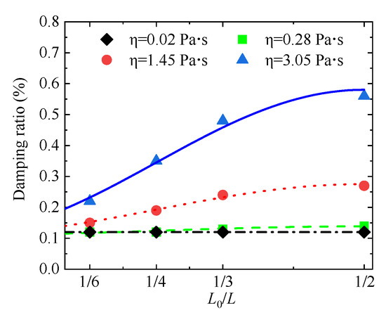 To investigate the influence of structural frequency, damper parameters, and vibration amplitude on system damping performance, experimental cases comprising five structural spans, three shear areas (single-, double-, and triple-pipe configurations, see Figure 10d), four liquid viscosities, and four suspended masses were designed. Furthermore, under the configuration with a 2.9 m span and 4 kg suspended mass, the effect of damper installation location on system damping performance was analyzed. Detailed experimental cases are provided in Table 1. The viscosity coefficient of the damping fluid was measured using the falling-sphere viscometer method [34]. For comparative purposes, dynamic characteristics of the damping-free structure were tested under varying spans and suspended masses.