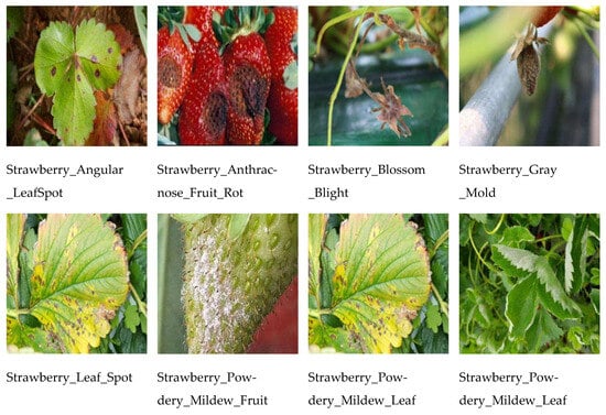 https://universe.roboflow.com/(accessed on 15 February 2025), and there were a total of 3568 strawberry disease images in the initial dataset. The original data has some conditions, such as some images are blurred, and the background interference and other problems, according to the following steps to carry out data cleaning: firstly, the duplicate collection of samples are eliminated, secondly, the blurred images due to the shooting of jitter or focus problems are filtered out, and finally, the interference images containing non-diseased areas or non-target crops are removed. After cleaning, the number of valid samples was reduced from 3568 to 3146, and the final constructed dataset contained seven disease categories, namely Strawberry_Angular_LeafSpot, Strawberry_Anthracnose_Fruit_Rot, Strawberry_Blossom_Blight, Strawberry_Gray_Mold, Strawberry_Leaf_Spot, Strawberry_Powdery_Mildew_Fruit and Strawberry_Powdery_Mildew_Leaf. Samples of each disease are shown in