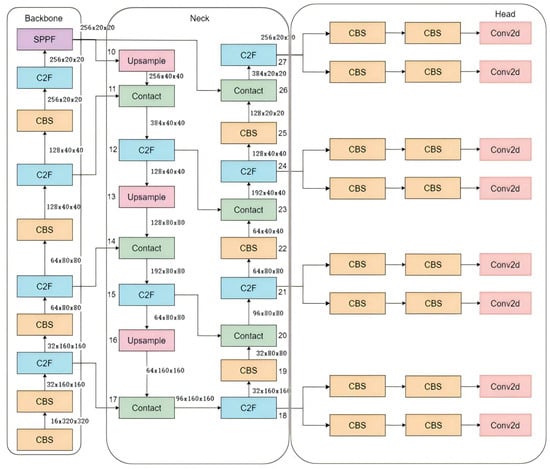 YOLOv8 by default adopts three detection heads (Heads), which correspond to large (256 × 256), medium (128 × 128), and small (64 × 64) scales of target detection, respectively [