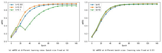 Figure 6a, we tested three learning rates of 0.001, 0.01, and 0.1 while maintaining the batch size at 16. Among them, the best performance is achieved when the learning rate is 0.01, and the mAP50 reaches 0.96. Using 0.001, convergence slows down and the final score is slightly lower (mAP50 = 0.948), while 0.1 leads to unstable training and a significant decrease in accuracy (mAP50 = 0.912), indicating that it crosses the optimal area of the loss surface.