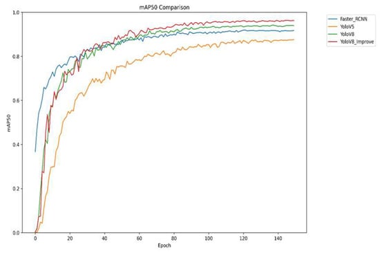 Figure 7, the improved YOLOv8 converges rapidly early in training, reaches a high mAP50 value sooner, and finally stabilizes at 0.96, outperforming all other models. These results robustly confirm the effectiveness of the proposed improvements in boosting both detection accuracy and overall model performance.