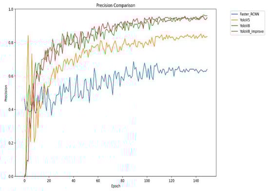 Figure 8 presents the variation in accuracy of the different models during the training proportion of correctly detected targets to the total number of targets detected by the model, the data in the figure shows that the improved YOLOv8 presents the best accuracy, with the highest accuracy value at the late stage of training. This means that the improved YOLOv8 has higher accuracy in detecting strawberry diseases, and it can identify diseased areas more efficiently, reduce the situation of false and missed detection, and improve the reliability of disease detection.