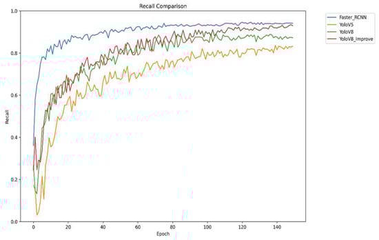 Figure 9 shows the trend of recall of different models during the training process. Recall refers to the proportion of the number of targets accurately detected by the model to the number of targets that actually exist, which is a key indicator for evaluating the comprehensiveness of the model. However, the improved YOLOv8 has significantly improved its recall through a series of improvements, such as optimizing the network architecture and improving the loss function. The improved YOLOv8 provides a more comprehensive coverage of strawberry diseases and reduces the occurrence of missed detection, thus improving the completeness of disease detection.