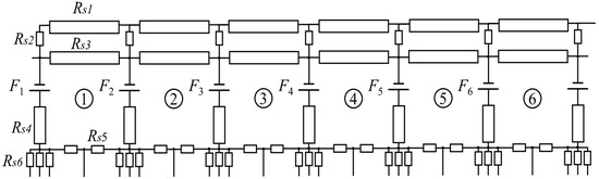 This paper focuses on the research of 6-phase magnet-shaped PMSMs. A schematic diagram of a single slot of the stator is shown in Figure 2. The magnetic network of the stator part under one pole is illustrated in Figure 3. Considering the impact of the PM structure on the motor, the magnetic circuit of the stator is simplified. The stator yoke is divided into two layers of tangential magnetic reluctance, Rs1 and Rs3, and one layer of radial magnetic reluctance, Rs2. Since the stator flux flows mainly through the teeth, the influence of the leakage flux in the teeth is ignored. The teeth are mainly divided into internal radial reluctance Rs4 and external radial reluctance Rs6. The excitation of the windings in the slot is treated as a uniform magnetic source placed in adjacent teeth, with the slot being equivalent to two layers: the inner layer, which consists of upper and lower equally wide rectangular slots, and the outer layer, designed as a trapezoid and equivalent to a single layer of tangential magnetic reluctance Rs5. hs is the slot depth, bs is the slot width, hs0 is the slot shoulder height, bs0 is the slot width, Wt is the stator tooth width, and Fξ (ξ = 1, 2, 3…) is the magnetomotive force (MMF) in the ξth tooth.