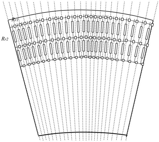 The PM employs an eccentric magnet-shaped method, which generates an approximate sinusoidal magnetic field in the air-gap, thereby reducing MMF harmonics. Since parallel magnetization is adopted in the PMs, the magnetic circuits of the air-gap and PMs are divided in a direction parallel to the PMs. The air-gap part is divided into two layers of perpendicular magnetic resistance and two layers of tangential magnetic resistance. Because the relative permeability of PM is approximately 1, the magnetic resistance of PM is considered equal to that of air. The air-gap magnetic resistance is divided into 24 branches according to the branch, corresponding with the stator magnetic circuit division from the previous section. The magnetic circuits of the air-gap and PM are illustrated in Figure 4.