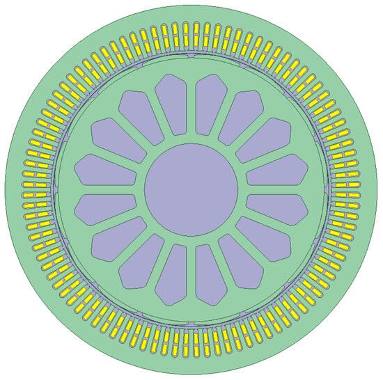 A six-phase 96-slot 16-pole eccentric magnet-shaped PMSM is used to verify the accuracy of the MNM. The material of the motor silicon steel sheets is DW310_50, and the material of the PM is N42SH. The design parameters are listed in Table 2. In order to minimize torque ripple, the length of the air-gap is designed as 4.7 mm, and the eccentric distance of the PMs is given as 100 mm. This motor design can reduce the demagnetizing effect of the stator current on the magnetic field, ensuring that the AGFD is close to a sine waveform. Based on these parameters, the finite element simulation model is established, as shown in Figure 8.