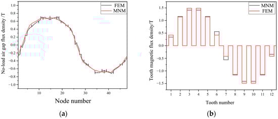 The comparison of air-gap and tooth flux density of the motor under no-load conditions obtained by MNM and FEM is shown in Figure 9.
