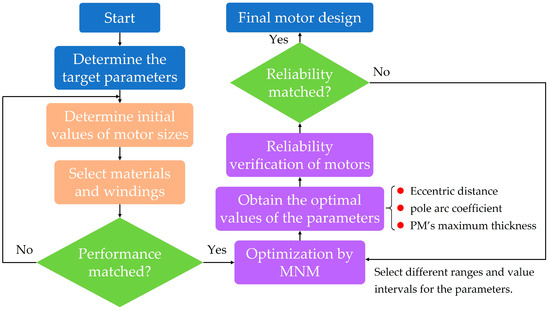 Firstly, the target parameters are determined, including output power, size constraints, output torque, voltage level, etc. Appropriate component materials and windings are selected based on experience to ensure they meet these basic performance parameters. Secondly, optimization is performed using the MNM to obtain the optimal values for parameters such as eccentricity, pole arc coefficient, and maximum thickness of the PMs. Subsequently, the reliability parameters, such as torque ripple and cogging torque, are verified to check if they meet the requirements. If the requirements are not met, different ranges and interval values of the parameters can be selected, and MNM optimization is re-conducted until the requirements are satisfied.