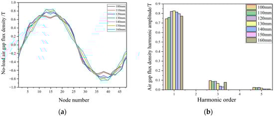 The eccentric distance affects the outer arc curvature of the permanent magnet, thereby influencing the value of MMF of the PM in MNM. In this paper, while keeping other motor parameters unchanged, the eccentric distance of the PM is set at intervals of 10 mm within the range of 100–160 mm. These values are input into the MNM for calculation, and the no-load AGFD waveforms and FFT analysis results are obtained, as shown in Figure 11.