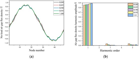 No-load AGFD waveforms and FFT analysis results under different pole arc coefficients: (a) no-load AGFD; (b) FFT analysis results.