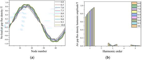 The maximum thickness of the PM affects the output power and efficiency of the motor. With the eccentric distance maintained at 140 mm, the pole arc coefficient at 0.9, and other parameters unchanged, the maximum thickness of the PM is set at intervals of 0.5 mm within the range of 6–9 mm. The no-load AGFD waveforms and FFT analysis results are obtained through MNM, as shown in Figure 13.