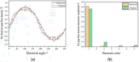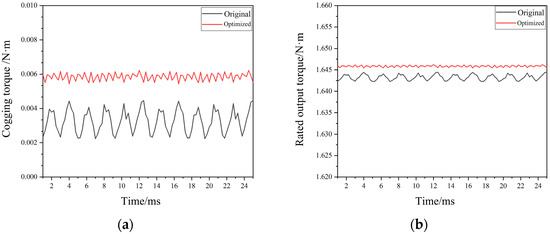 The AGFD waveforms before and after the optimization under no-load conditions are shown in Figure 14. Meanwhile, Figure 15 displays the cogging torque and rated output torque waveforms in both pre-optimization and post-optimization states.