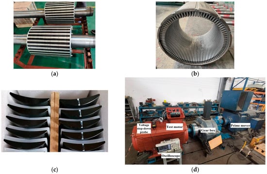 The structural parameters of the motor, including eccentric distance, pole arc coefficient, and PM’s maximum thickness, were optimized based on the MNM. After the structural parameters were determined, verification was conducted by the FEM to ensure that performance parameters could meet the requirements. A 50 kW rated power PMSM was manufactured. The main components of the prototype motor included the rotor, stator, and PM, as shown in Figure 16a–c. The motor testing platform is illustrated in Figure 16d. The test platform was composed of components that included a prime mover, a test motor, a gearbox, a frequency converter, a step-down probe, an oscilloscope, and other related elements. The prime mover and the test motor were coaxially connected via the gearbox, in which a torque sensor was installed to measure torque. Meanwhile, the step-down probe and oscilloscope were used to collect voltage and current waveforms. In the operation, a frequency-conversion variable-speed motor equipped with a commercial variable-frequency drive (MM430 from SIEMENS) was mechanically connected to the prototype motor to provide load.