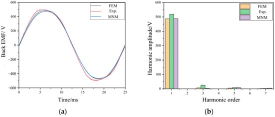 Comparison of results given by MNM, FEM, and experiment (Exp.): (a) induced EMF; (b) harmonic amplitude.