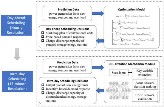 To address the above gaps, this study develops a multi-time scale coordination scheduling framework integrated with attention-enhanced DRL, balancing cost minimization and renewable utilization while improving real-time adaptability. The proposed framework combines two core stages: Day-ahead scheduling (hourly resolution), which optimizes conventional generators, pumped hydro storage, electrochemical energy storage, and price-based demand response (PDR) to minimize total operational costs; and intra-day rolling scheduling (15 min resolution, 4 h horizon), which adjusts wind power, battery operation, and incentive-based demand response (IDR) in real time. Notably, the intra-day stage uses an attention-based Actor–Critic DRL algorithm—dynamically weighting critical variables (e.g., wind forecast errors, storage SOC) to correct deviations, overcoming the lack of targeted decision-making in existing DRL methods.