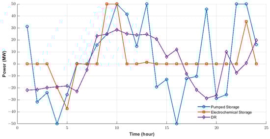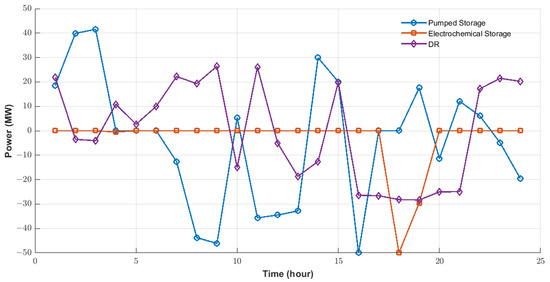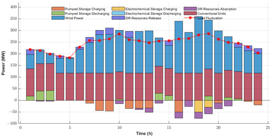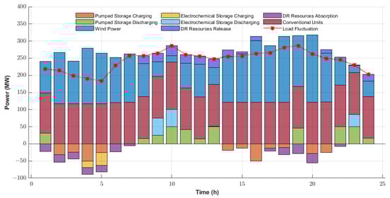 Scheduling schemes for both scenarios are detailed in Figure 4 and Figure 5, where each curve represents the cumulative output of preceding components plus the contribution of the current unit or DR resource. Notably, the red curve (denoting load fluctuations) maintains balance with the combined outputs of conventional units, storage systems, and wind power across all periods. Meanwhile, Figure 6 and Figure 7 illustrate the operational plans for pumped storage, electrochemical storage, and demand response resources across the two scenarios. A closer look at DR resource behavior reveals distinct diurnal roles: daytime usage focuses on peak shaving and damping wind power volatility, while nighttime operations shift to valley filling. This division aligns with the contrasting patterns observed in wind power and load interactions. In reverse peak shaving scenarios, wind power generation surges during early morning (2:00–6:00) and evening (16:00–21:00)—periods when non-DR loads are low. Here, active DR resource activation and storage charging effectively boost wind power absorption. Conversely, during peak shaving, wind power output aligns more closely with load curves, peaking at midday (10:00–14:00) and afternoon (16:00–19:00). The high non-DR load during these windows reduces the need for DR resources compared to reverse peak shaving at the same times.