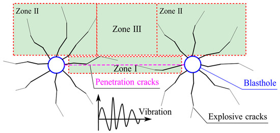 With the large-scale construction of large underground power plants in China, there is an increasing need for refined control over plant safety and quality, particularly concerning the vibration and damage of surrounding rock [1,2,3]. In the process of blasting excavation, the propagation and evolution of blast stress waves play an important role in the rock fracture and fragmentation [4,5,6]. These directly influence the vibration response strength and damage area. As shown in Figure 1, the primary objective of blast fracturing is to use inter-hole blast action to promote the crack expansion in zones I, II, and III, which means a greater crushing effect.