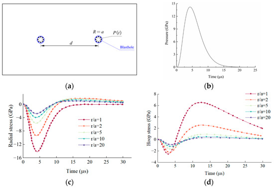 Figure 2a shows a double-hole blasting action model. For an explosion, taking the cylindrical charge structure as an example, the pressure–time curve (Figure 2b) will be applied to the blasthole wall. The stress–time curves of blasting load were obtained from the Laplace transform [22] and the Dubner method [38]. The detailed solution process is omitted here. Notably, the blast-induced hoop stress initially experiences compression and then rapidly transitions into a state of significant tensile stress (Figure 3b), which may be the main cause of rock tensile damage.