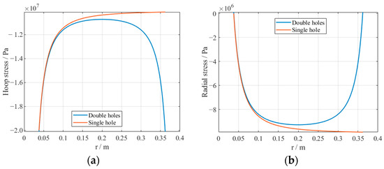 Static stress field characteristic of double-hole blasting: (a) hoop stress; (b) radial stress (single hole corresponds to a single hole at r = 0 m; double holes have two holes at r = 0 and 0.4 m).