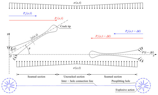 As indicated by the foregoing analysis, during the formation of inter-hole cracks via presplitting blasting, the propagation of initial radially oriented cracks—induced by the blast—governs the inter-hole fracture process. Subsequent crack evolution occurs under the combined influence of the explosive stress wave, the pressure of detonation gases, and the dynamic in situ stress field. The mechanical model describing the dynamic crack process is represented by the following expression: