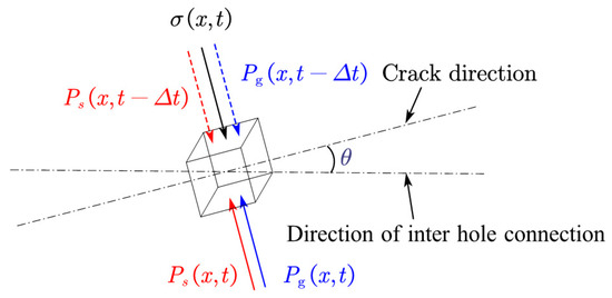For the fractured section, variations in crack opening displacement can significantly influence the transmission and efficiency of explosive energy. The evolution of the crack aperture is governed by the stress conditions—specifically, the dynamic in situ stress and the blast-induced loading —as well as the rock deformation characteristics. The blast loading applied to the surface rock mass element comprises two components: the residual hoop stress resulting from the explosive stress wave and the hoop stress due to the detonation gases’ pressure. The mechanical response of the rock unit on the fracture surface can be characterized by an equation that incorporates the effects of stress waves originating from adjacent blastholes.