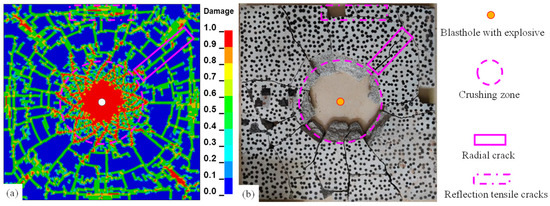 Additionally, blast damage testing was employed to confirm the validity of granite parameters. A granite slab measuring 40 cm × 40 cm × 2 cm was used for the test. A hole of 15 mm in diameter was drilled in the center of the slab, and it was then filled with 4 g of explosive while it was kept in a stress-free environment. The results are displayed in Figure 7, and it can be noted that the numerical simulation results under the current granite settings are largely comparable with the explosion test results. Both crushing zones have a diameter of about 15 cm, and they both have obvious radial cracks. As a result of the boundary’s reflection, there is also clear reflecting tensile damage near the boundary and clear circumferential cracks around 3~5 cm away from the boundary. These findings support the validity of the adopted granite parameters in characterizing cracking damage in granite rock under blast loading. Although the same rock type also exists, there is variation in parameters such as wave velocity, but it does not affect the overall hard and brittle rock law; the hard rock of dolomite and granite, as well as both the stress–strain curve and other properties or parameters exhibited by the damage characteristics and cracking law, is also similar [42,43,44].