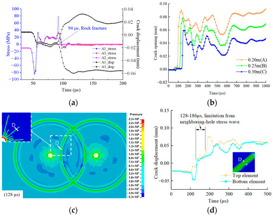 Figure 10a firstly presents the displacement–time history of the crack unit and crack surface units on both sides of the crack. Additionally, it also shows the normal stress–time curve of section A. Upon rock fracture, the rock unit A2 experiences stress dynamic unloading, with the tensile stress quickly being unloaded to zero. In contrast, the adjacent rock units A1 and A3 experience a continued increase in tensile stress before rapidly unloading, transitioning to compressive stress, and eventually converging to an equilibrium state. For a crack outside the hole, Figure 10b depicts the progression of the crack opening at 0.20, 0.25, and 0.30 m from the center of gravity. The crack opening is rapidly opened in conjunction with the rock cracking process and rapid unloading of its unit stress, followed by a certain degree of rebound under the action of ground stress. And the crack opening subsequently continues to rise under the action of blast pressure. For section D, the adjacent hole blast shock wave clearly limits the crack opening, as illustrated in Figure 10c,d. At 128–186 µs, the crack opening where section D is located is squeezed closed and stops extending.