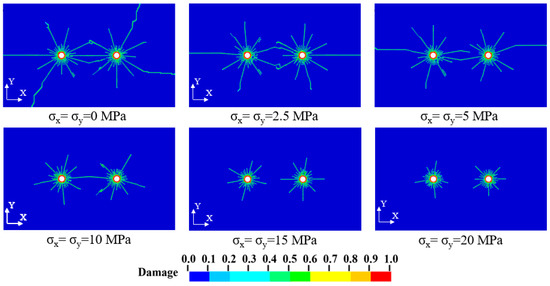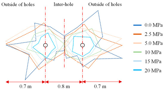 The complex in situ stress conditions present at the actual engineering sites significantly influence the inter-hole crack expansion of presplitting blasting. As shown in Figure 11, the crack patterns resulting from inter-hole blasting under various in situ stress environments are presented. It is discovered that when the stress level increases from 0 MPa to 20 MPa, the crack expansion reduces from about 0.75 m to 0.24 m. The inter-hole crack expansion range is lower than the crack expansion range on the exterior of the hole due to the influence of the adjacent hole stress wave, especially under lower stress levels (Figure 12). Under medium–high stress, however, the inhibitory impact of neighboring hole stress waves from adjacent holes on inter-hole fractures is reduced. Cracks around the blasthole consequently exhibit a confined pattern of uniform expansion.