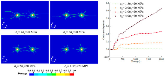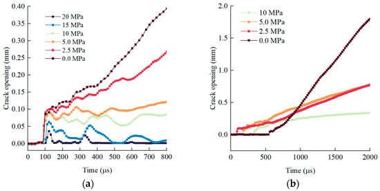 For the dynamic crack expansion process (Figure 13), they are essentially consistent with the previous results under . For unpenetrated cracks outside the holes (Figure 13a), as the ground stress level increases, the maximum value of the initial crack opening appears significantly lower, and the crack unloading rebound increases strongly, and then tends to close. Once a crack initiates and coalesces at the midpoint between two blastholes, the crack apertures typically increase during this process, forming a penetrated crack. And the lower the ground stress, the greater the openings (Figure 13b).