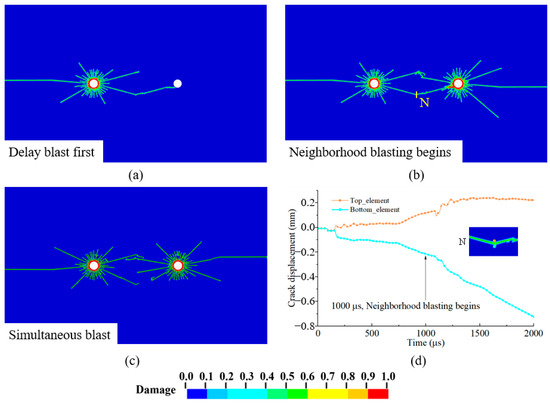 Figure 15 compares the crack dynamic expansion under delayed and simultaneous presplitting blasting conditions. In the case of simultaneous detonation (Figure 15c), cracks sprout and spread around both holes in the direction of the major stresses, eventually intersecting midway. The crack patterns of the two holes are basically symmetrical along the centerline of the holes. Under delayed detonation, the left hole explosion first induces cracks gradually in all directions more uniformly and extends to the right hole (Figure 15a). Upon detonation of the right hole, the damage was intensified at the fractures previously generated from the left hole, and the width of the penetration cracks was greatly enlarged (Figure 15d). Notably, large-angle cracks from the right hole between holes essentially did not appear, in addition to the intersection penetration of the existing cracks on the left hole (Figure 15b). The fact that the outside of the hole is essentially the same as the left side helps to explain the induction of existing cracks’ role in the explosion. Given the constraints of numerical modeling for finite element characterization following rock cracking, an explosive test will be conducted to further examine the molding effect of delayed presplitting blasting.