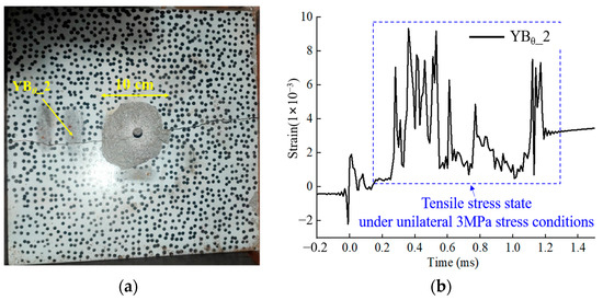 Firstly, Figure 17 illustrates the crack pattern resulting from single-hole blasting under 3 MPa uniaxial stress. The results indicate that the unidirectional principal stress predominantly governs the direction of the crack extension. A through crack with a width of approximately 1 mm forms in the principal stress’s direction, and a surface spalling range with a radius of approximately 5 cm forms in the blasthole’s proximal area. Because the location of the strain gauges mentioned above is essentially close to the explosion, some of them were destroyed in the explosion. The crack extension circumferential stress curve obtained by monitoring YBθ_2 (bursting center distance of approximately 10 cm, circumferential arrangement) is provided here. After the initial compression and tensile action, a considerable tensile stress condition was exhibited. This finding is also compatible with the numerical simulation of crack opening with the continuous action of tensile stress, as described previously.