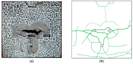 The blasting effect of rock plate cracking under millisecond blasting: (a) rock slab fragmentation; (b) crack extension pattern. The green lines represent only the location of the cracks.