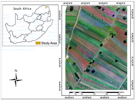 The small-scale farms in which the current study was conducted are found in the Mutale River catchment, situated in the Vhembe District of the Limpopo Province of South Africa. This area is dominated by small-scale farmers who practice substantial farming. The study area is located at the 22°47′41.95″ S, 30°29′08.21″ E and 22°47′58.61″ S, 30°29′19.83″ E grid reference location, at an elevation which ranges between 620 m and 660 m above sea level. The presence of various small-scale crop types that are cultivated under the irrigation system prompted the selection of the study area. In this area, farmers tend to cultivate a variety of crops irrespective of the season. Some of the crops cultivated in the study area include maize, cabbage, sweet potatoes, and sugar bean [11]. Figure 1 presents the location of the study site in South Africa.
