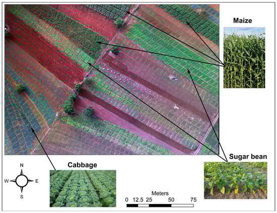 During the field observation of the study area, a total of three (3) types of crops were identified in the study area, and these were cabbage, maize, and sugar bean. Figure 2 shows various crop types that were identified in the study area, as imaged by the UAV system.