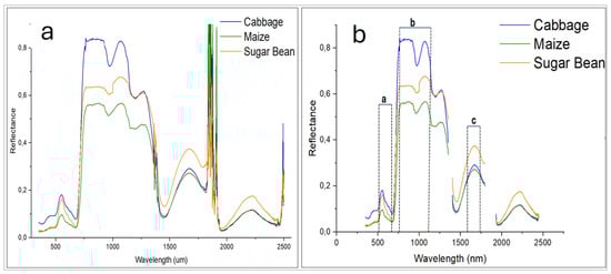 From Figure 3a, cabbage showed a higher reflectance in the visible–NIR spectral region when compared with other surveyed crops, with sugar bean showing a high reflectance than other crops in the SWIR spectral region. From Figure 3b, clear reflectance disparities were noted in the four labeled spectral regions (i.e., a–c in Figure 3b). By implication, reflectance data generated from these spectral regions could be ideal for thresholding the surveyed crops.