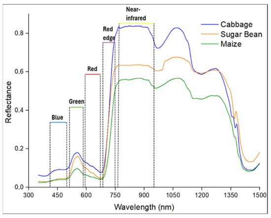 Analysis of spectral reflectance properties of the surveyed crops in spectral wavelengths corresponding to UAV spectral bands showed that these crops can be spectrally differentiated in the Green and NIR spectral wavelengths. In the Blue spectral band, only cabbage could clearly be identified due to its higher reflectance compared to other surveyed crops, while maize had a similar reflectance with sugar bean (Figure 4).