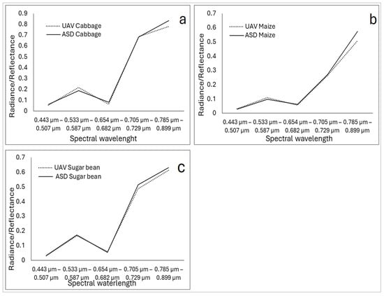 From Figure 5, both the UAV mean radiance and ASD mean reflectance properties of the surveyed crops were noted to follow similar pattens across the specified spectral wavelengths. However, the UAV mean radiance showed a slight deviation from the ASD mean reflectance of the cabbage in the 0.533 µm–0.587 µm and 0.785 µm–0.899 µm spectral wavelengths (Figure 5a). In Figure 5b,c, the discrepancy between the UAV mean radiance and ASD mean reflectance for maize was noted in the 0.785 µm–0.899 µm spectral wavelength.