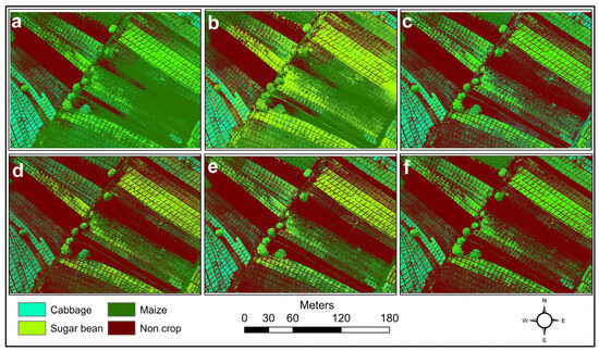 Differentiation of crop types using (a) MLT on Blue band, (b) MLT on Green bands, (c) MLT on NIR, (d) MLP, (e) RBFNN, and (f) SOM.