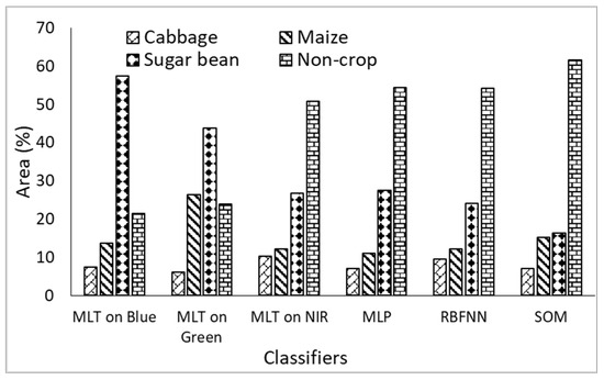 From Figure 7, the area covered by cabbage crops, as predicted by the MLT on Blue band, MLT on Green band, MLT on NIR, MLP, RBFNN, and SOM, was noted to be 7.46%, 6.01%, 10.33%, 7.05%, 9.48%, and 7.04%, respectively. The area covered by maize crops, as predicted by the MLT on Blue band, MLT on Green band, MLT on NIR, MLP, RBFNN, and SOM was noted to be 13.62%, 26.41%, 12.12%, 11.03%, 12.19%, and 15.11%, respectively. Sugar bean was noted to occupy 57.51%, 43.72%, 26.77%, 27.44%, 24.15%, and 16.33%, as predicted by the MLT on Blue band, MLT on Green band, MLT on NIR, MLP, RBFNN, and SOM, respectively. Generally, the misclassification of crops was noted in all crop classes predicted by all the deployed classification techniques. In Figure 6a, MLT on the Blue spectral band predicted maize crop, even in areas occupied by bare surface that was classified as maize crop. In Figure 6c, the MLP predicted cabbage in areas covered by sugar bean.