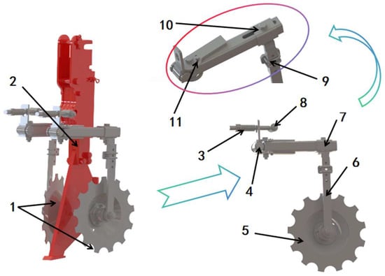 Schematic diagram of the overall structure. (1) Flow diversion and cutting components, (2) deep loosening components, (3) imitation structure, (4) guiding arm pivot shaft, (5) diversion and pressure wheel, (6) guide wheel arm, (7) corner adjustment structure, (8) imitation structure arm, (9) height adjustment structure, (10) flow arm length adjustment structure, and (11) arm angle adjustment structure.