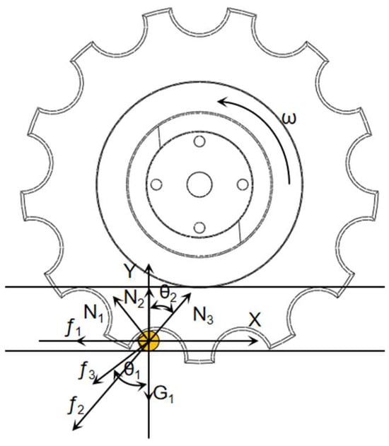 When L1 is positioned at the center, it is set to 0. Combining kinematic analysis and dynamic equilibrium, L1 is calculated as follows: In Figure 6, v1 is decomposed along the X-direction to obtain its horizontal component v1x. The total effective velocity of the component in the horizontal direction is the sum of the active velocity v0 and the horizontal component of the slip velocity v1x. The calculation formula for L1 is derived based on the changes in momentum and displacement velocity, and the specific formula is shown as Equation (5):