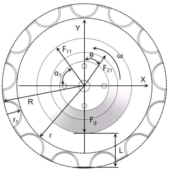 where L = depth of stubble penetration into the soil (cm), R = radius of the diversion disc (cm), r = inner blade distribution radius (cm), r1 = inner blade radius (cm), k = the mass factor of the guide wheel (related to the material, kg/cm2), m = the total mass of the guide wheel (kg), Fy = the resultant force of external forces on the guide wheel (N), F11 = the resultant force of the straw on the ground acting on the wheel during operation (N), F21 = the resultant force of the disturbed soil and the ground acting on the wheel (N), α1 = the throwing angle of straw (related to the physical properties of straw), and θ = the angle of repose of soil (related to the physical properties of soil).