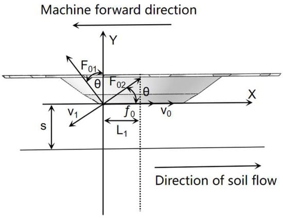 where v1 = the rebound velocity of soil when it comes into contact with the wheel edge, v0 = the soil diversion velocity, and S = the distance from the wheel to the center of the seedling belt, i.e., half the width of the seedling belt. Once other parameters are determined, S becomes a fixed value automatically, F01 = the force exerted by the subsoiled soil on the wheel edge, ƒ0 = the vertical directional force of the soil, F02 = the force exerted by the rebounded soil on the device during soil diversion, and it is a longitudinal force that promotes soil flow, θ = the soil repose angle, which is related to the physical properties of the soil, and L1 = the distance from the diversion wheel to the subsoiler and, in practice, it is equivalent to the displacement of the soil after being disturbed by the subsoiler.