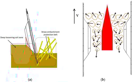 (a) Schematic diagram of guide wheel operation, yellow represents wheat straw. (b) Schematic diagram of guide wheel guide fragmentation. Red represents the deep loosening shovel, circles represent soil particles, and arrows indicate the direction of soil flow.