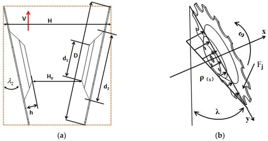 Given that the overall width of the seedbed strip ranges from 25 cm to 35 cm, the lateral spacing available for the soil-guiding wheels is highly limited. To address this constraint and improve the efficiency of soil guiding and passage, an angular offset design for the wheels was adopted. Based on the angular relationship between the wheel orientation and the machine’s forward direction, the offset angles are categorized into three types: positive offset, parallel (zero offset), and negative offset. Variations in the offset angle directly affect two key operational performances: The contact area and pressure between the wheel and straw change with the offset angle, influencing the degree of straw compaction and cutting. The direction of soil flow is altered by the offset angle, which impacts the uniformity of soil distribution in the seedbed strip and the likelihood of blockages. A schematic diagram of the stubble-crushing process by the offset soil-guiding wheels is presented in Figure 7a, while a schematic of soil guiding and crushing is shown in Figure 7b.