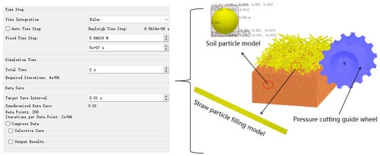 Based on the data in Table 1, the parameters for the soil particle model, straw particle model, and device material were configured in EDEM software (8 EDEM 2022) []. The contact model between particles is the Hertz Mindlin with JKR model, and the contact model between particles and geometry is the Hertz Mindlin (no slip) model. The basic size of the soil trough was set to 800 mm × 600 mm × 300 mm. A hollow straw model with a length of 120 mm and a diameter of 5 mm was established using small balls with a diameter of 0.5 mm. In the straw generation stage, bonds were added between straw particles to simulate the real straw distribution. The straw particles were generated in a normal distribution. When soil was generated in the soil tank, adhesive bonds were used to bond the soil, and the radius of soil particles varied within the range of 0.8 to 1.2 times the average radius. As the device is mainly responsible for preventing straw from slipping off and soil splashing after strip straw stripping, a disturbance device for straw was placed in front of the device to simulate the strip straw stripping process during simulation experiments. After the preparation of the soil tank was completed, we imported the three-dimensional model of the stubble diversion device and set its material parameters. The grid size was 3Rmin, the simulation time step was 5 × 10−7 s, the total simulation time was 2 s, and the data storage interval was 0.01 s. We conducted simulation experiments. The simulation model is shown in Figure 9 [].
