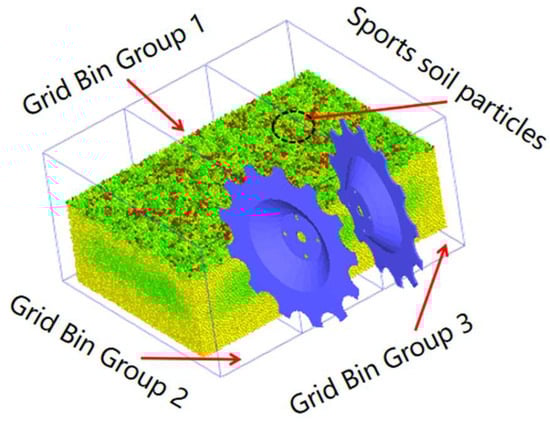 The lost soil was quantified via statistical grid calculations in EDEM’s post-processing module, where a Grid Bin Group was established to monitor soil particle displacement. Three statistical grids were arranged transversely along the forward direction, each with dimensions of 800 mm × 200 mm × 300 mm. These grids were symmetrically positioned within the 60 cm seedbed strip, with their bottoms close to the model base and their tops extending above the soil surface (as illustrated in Figure 10). This configuration ensures comprehensive coverage of potential soil lateral displacement zones. During operation of the stubble-crushing and soil-guiding device, the subsoiling shovel disturbed the soil in the seedbed strip, causing lateral slippage of soil particles. The pre-configured grid sensors dynamically tracked and recorded changes in the number of soil particles within each grid, providing quantitative data to calculate the soil loss rate, defined as the proportion of particles displaced outside the target seedbed strip relative to the initial particle count.