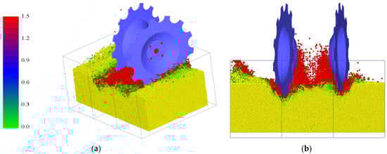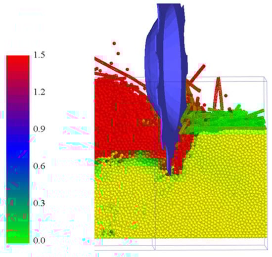 During the simulation, soil particles disturbed by the stubble-crushing and soil-guiding device move at varying initial velocities. These moving particles mix with stationary ones, making it difficult to directly quantify the degree of soil loss through particle count alone. To address this challenge, soil disturbance was visualized and characterized by particle velocity. As illustrated in Figure 10, particles were color-coded based on their initial velocities: red particles represent high-velocity disturbed particles, while particles of other colors correspond to progressively decreasing velocities. High-velocity soil particles (red) are “active particles” that are highly prone to splashing outside the seedbed strip. Thus, the proportion of red particles within the seedbed strip was used as an indirect indicator of soil-guiding performance: a lower number of red particles outside the device boundary indicates a better soil-guiding effect. By extension, the same velocity-based characterization applies to straw movement: a higher number of high-velocity straw particles at the edge of the seedbed strip means the straw is more likely to backfill or slip into the seedbed—directly reflecting a poorer stubble-crushing performance.